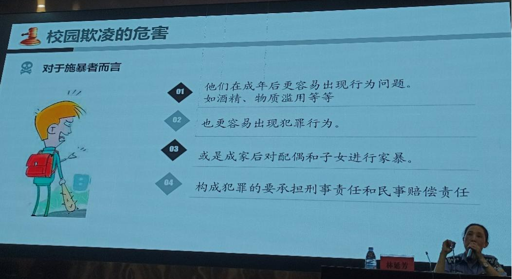 讲座正式开始前,林延芳与同学们亲切互动,引导学生思考什么样的行为算是“校园欺凌”,同学们热情分享了自己的看法。随后,林警官深入讲解了什么是校园欺凌,校园欺凌的表现、特征、危害、产生的原因,以及遇到校园欺凌我们能做什么。