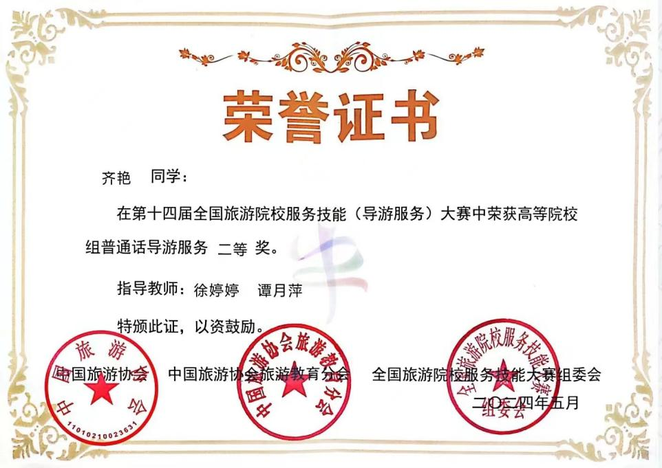 近日,备受瞩目的第十四届全国旅游院校服务技能(导游服务)大赛在郑州旅游职业学院圆满闭幕。我校旅游管理专业学生王朱珠、齐艳经过三天紧张激烈的角逐,凭借扎实的专业知识、出色的语言表达能力和精彩的才艺展示,最终分别荣获一等奖和二等奖的佳绩。