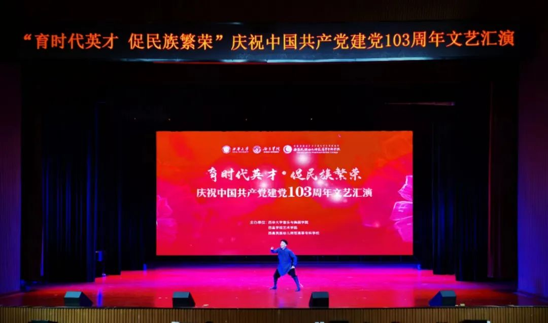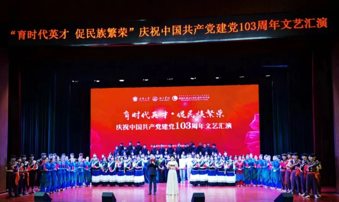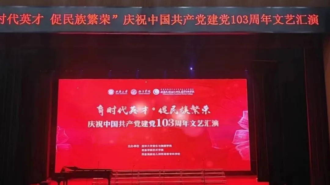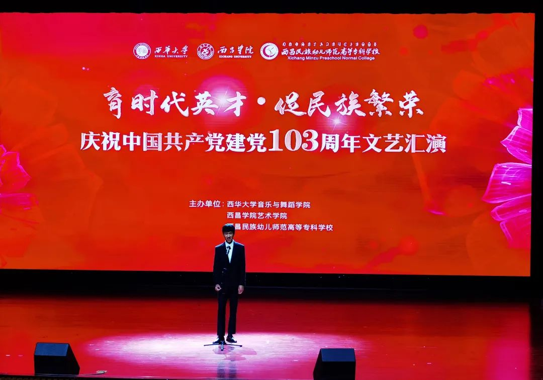 为庆祝中国共产党成立103周年,热情讴歌党的光辉历程,教育引导学生听党话、跟党走,立志扎根人民、奉献国家。7月2日晚,由西华大学音乐与舞蹈学院发起,西昌学院艺术学院、我校艺术教育系共同主办的“育时代英才·促民族团结庆祝中国共产党成立103周年文艺汇演”在我校雏鹰剧院举行,三校师生共同观看了演出。
