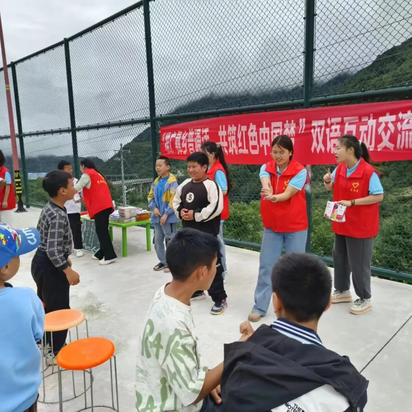 “筑梦童言”普通话启航团还开展了双语交流会,在充分调动参与者的积极性后,团队成员与当地孩子们共同阅读、讲述红色故事,分享在学习普通话过程中遇到的困难,提出有效的解决方式,通过分享交流的形式增进双方感情,锻炼彝乡孩子们的语言表达能力,帮助孩子们有效学习普通话。