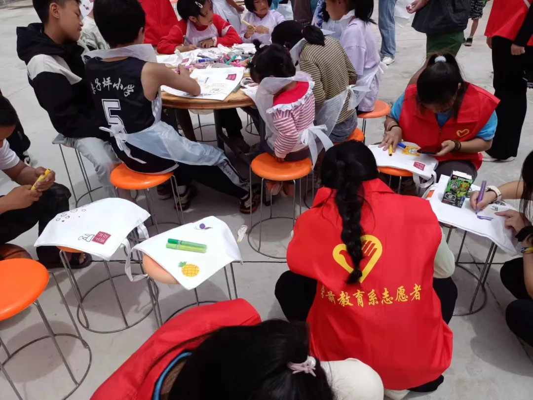 活动最后,团队成员带领当地孩子一起用丙烯颜料、马克笔在空白帆布包上绘出喜欢的图画,共同唱响《我和我的祖国》。