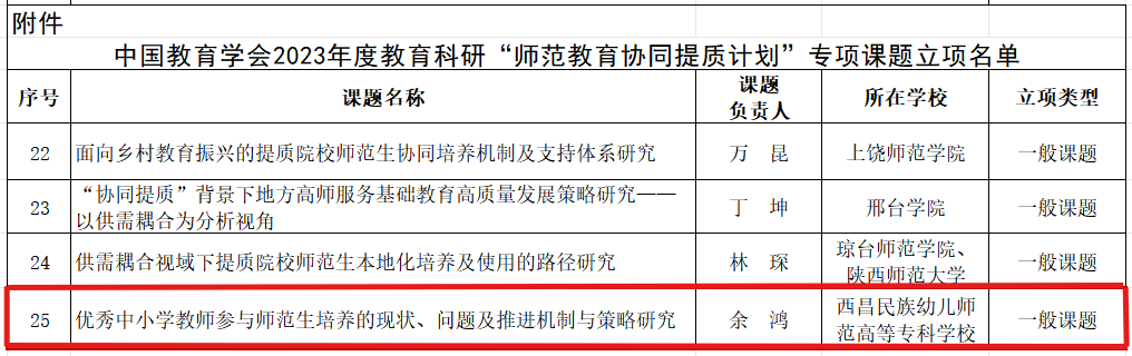 中国教育学会2023年度“师范教育协同提质计划”专项课题自2023年11月征集,收到申请203项,立项课题25项。我校余鸿负责的《优秀中小学教师参与师范生培养的现状、问题及推进机制与策略研究》有幸获批立项。