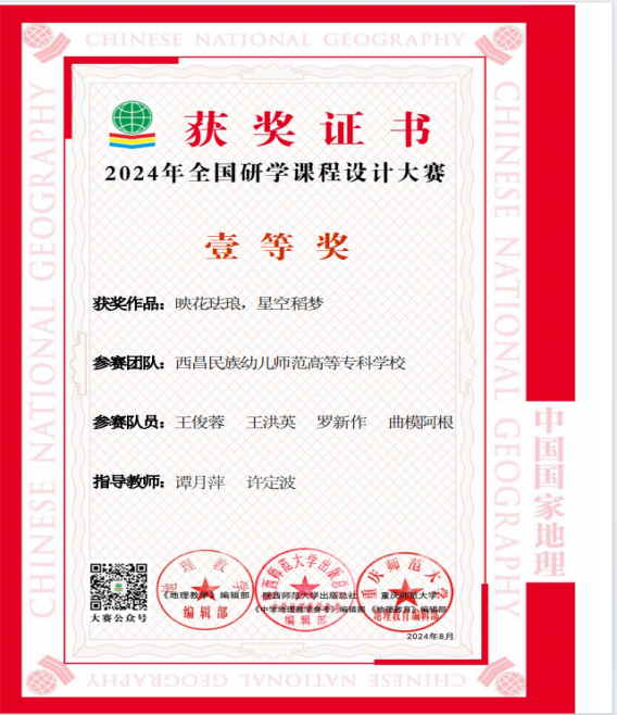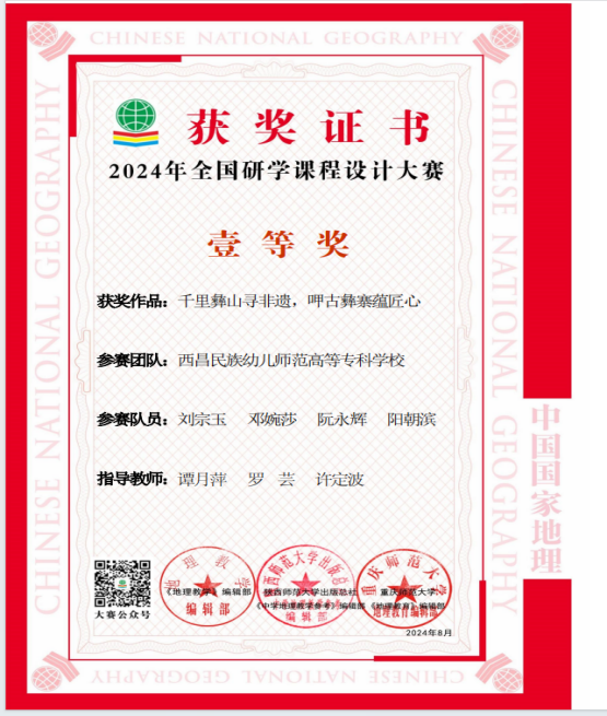 刘宗玉小组以西昌市、越西呷古彝寨为研学基地,依托国家级非物质文化遗产(洞经古乐)和彝族非遗文化(彝族刺绣制作、彝族黄油伞、彝医药)四个研学课程,最终设计出以“千里彝山寻非遗,呷古彝寨蕴匠心”的研学课程,荣获一等奖。