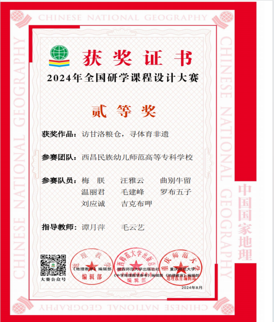梅联小组以甘洛县为研学基地,立足于甘洛县非遗体育(体育强国)与多彩梯田(传统农耕文化与现在文明的结晶),打造具有地域特色的研学课程(寻甲古甘洛粮仓,探彝族摔跤技艺,领略磨尔秋独特魅力,邂逅神秘尔苏箭韵),让学生体会非遗体育文化的独特魅力,领略多彩梯田的农耕智慧,增强其对劳动创造价值的认识和尊重,促进学生德智体美劳全面发展。最终设计出以“访甘洛粮仓,寻体育非遗”的研学课程,荣获二等奖。