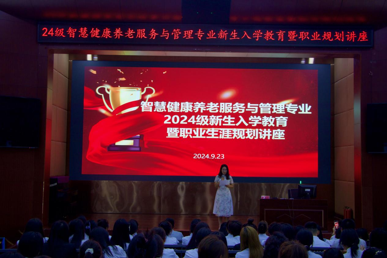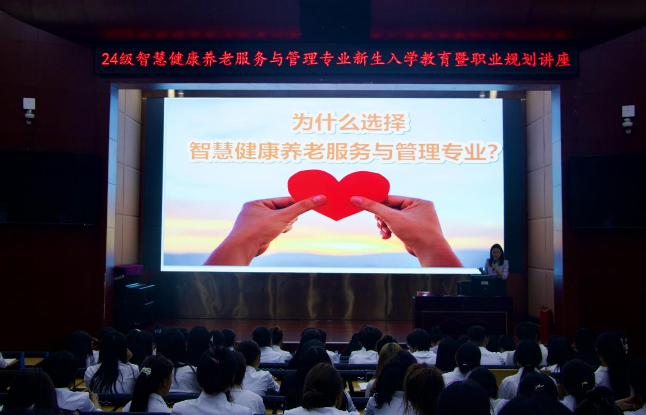 智慧健康养老服务与管理专业在学术报告厅A厅隆重举行了新生入学教育暨职业规划讲座。活动由教研室主任鄢补尔卓主持,邀请九如城西南中心教培事业部总监李佳幸开展讲座,教研室专任老师、新生辅导员以及24级全体新生参与。