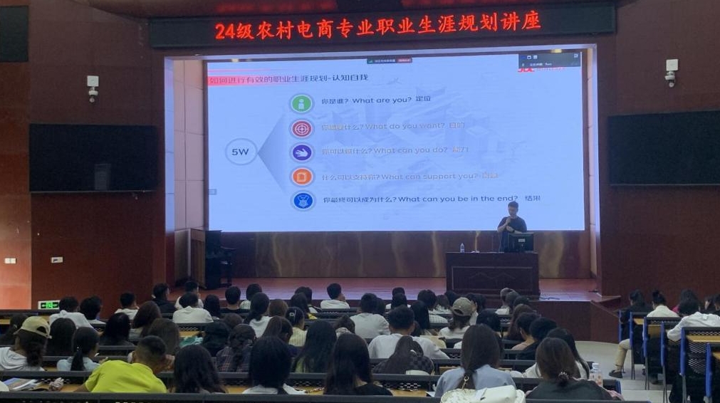 京东西南分公司人力资源部高级创业指导师张景可先生在学术报告B厅为2024级农村电子商务专业的新生们带来了一场意义深远的职业生涯规划宣讲会。
