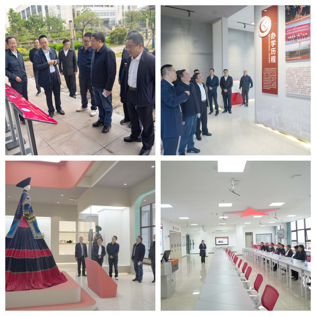 郭建春一行先后走访调研了校情展示馆、非遗博物馆、美术馆、伟大建党精神和思政教育虚拟仿真实训室,全方位了解学校思想政治教育、校园文化建设和非遗传承创新等方面的情况。
