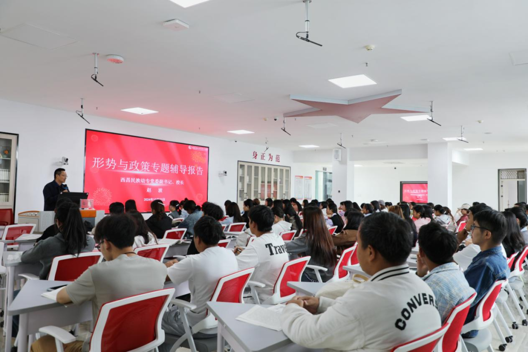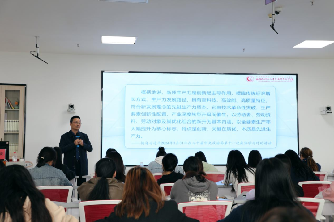 赵波强调,我们要充分认识发展新质生产力是推动高质量发展的内在要求和重要着力点,是时代所需、发展所急、大势所趋;教师们要引导学生密切关注新质生产力的发展趋势,主动融入这一发展浪潮,不断提升专业知识和技能,为实现经济社会高质量发展作出贡献。报告会上,赵波通过网络热点、时事政治及学生们感兴趣的话题举例,深入浅出的介绍了什么是新质生产力及新质生产力的重要意义,激发了学生的学习兴趣。