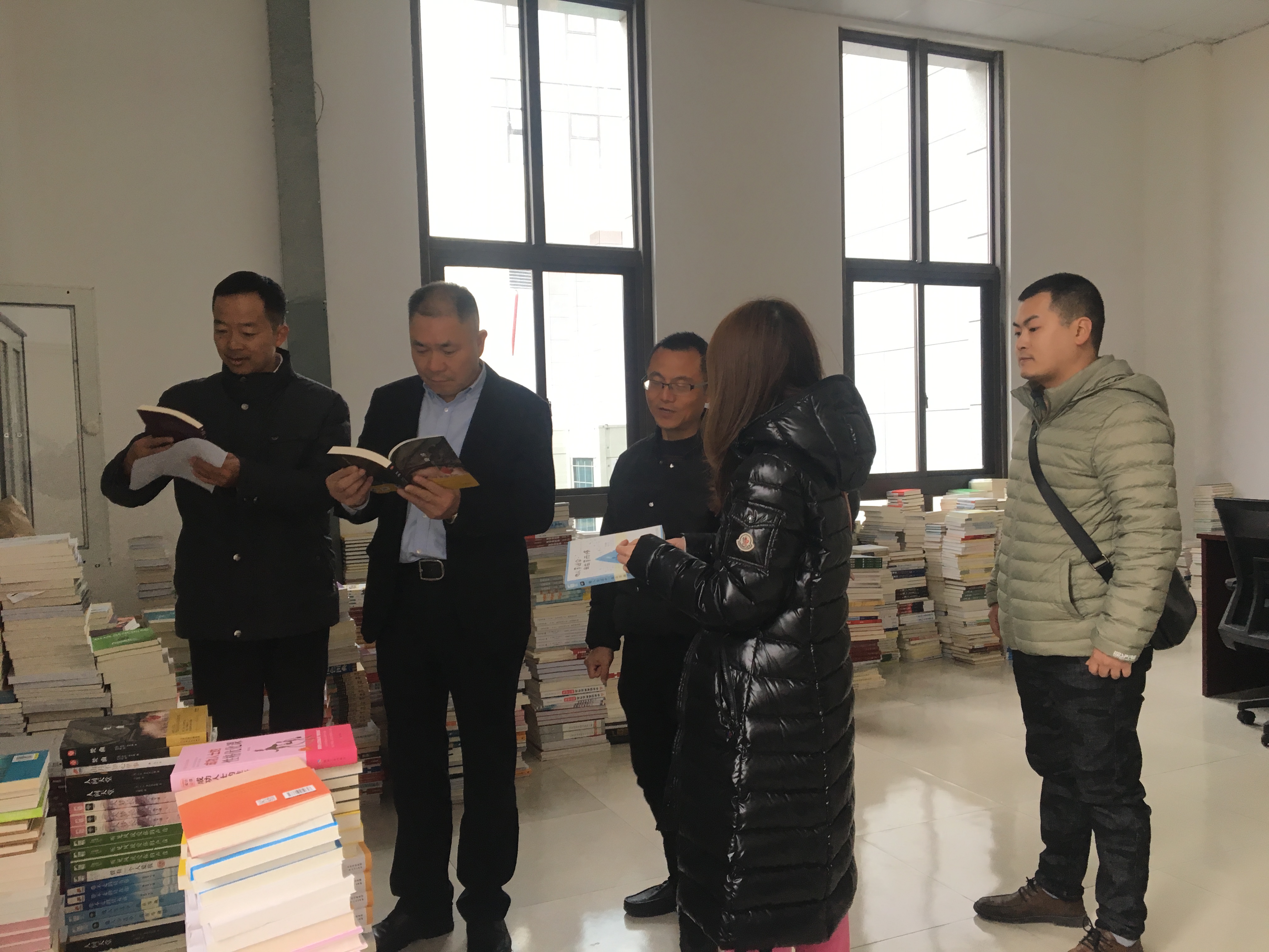 张昌元一行在图书馆馆长廖德凯的陪同下对该校捐赠的10000册图书进行检查验收、上架指导工作。张昌元一行听取廖德凯关于图书馆的工作汇报和发展计划,认真翻阅查看资料和所赠图书的分类、编目,询问图书接收情况以及图书借阅和管理情况。