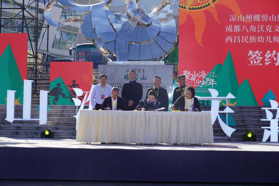 近日,我校党委委员、副校长王晓东,职业教育系党总支书记、系主任曾艳一行人前往螺髻山景区,参加“聚山海•庆新年”彝历新年系列活动,并与凉山州螺髻山景区管理局、成都八角沃克文化传媒有限公司签订了校企合作协议。