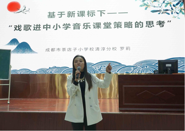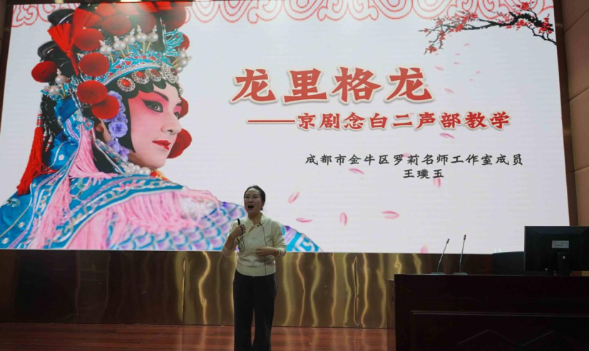 名师工作室成员——成都市协同外国语学校王璞玉老师和成都市金牛区北站小学雷小芳老师带来的《龙里格龙》和雷小芳老师带来的《校园小戏迷》,以戏曲传承发展为导向,多种表现形式让学生感受传统戏曲中的唱念做打,充分展示了传统戏曲的魅力。