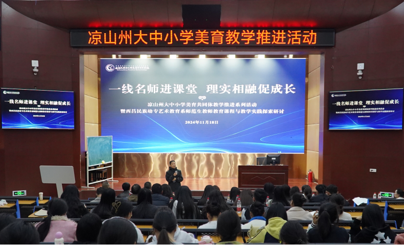 近日,我校艺术教育系邀请“成都市金牛区罗莉名师工作室”、“成都高新区寇忠泉—万里燕名师工作室”到我校开展“一线教学名师进课堂,理实相融促成长——西昌民族幼专艺术教育系师范生教师教育课程与教学实践探索研讨暨凉山大中小学美育共同体教学推进活动”。副校长袁顶国致辞。
