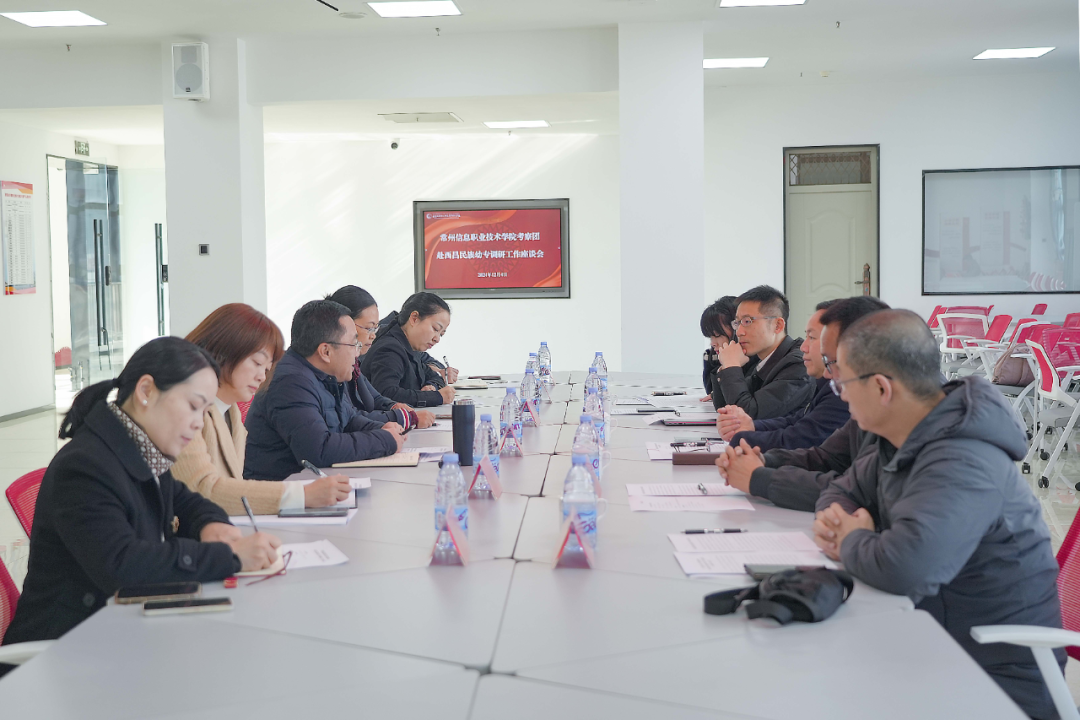 12月4日,常州信息职业技术学院党委书记成建华一行到我校交流调研。学校党委书记卢立武,党委副书记、工会主席王玉萍陪同调研,党委委员、宣传统战部长邹春芸及相关部门负责人参加座谈会。