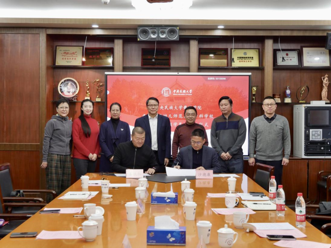 12月6日,在中央民族大学16号楼舞蹈学院会议室,我校与中央民族大学舞蹈学院共建校外实践教学基地签约仪式顺利举行。中央民族大学党委常委、副校长石亚洲,舞蹈学院党委书记马娟,舞蹈学院院长姜铁红,舞蹈学院党委副书记、纪委书记李依霖,民族民间舞第一教研室主任马啸,学工办常务副主任、党务秘书李慧娟;我校党委书记卢立武,党委委员、纪委书记沙德康,艺术教育系副主任胡云贵,艺术教育系党总支副书记王永禄参会。中央民族大学舞蹈学院党委副书记、纪委书记李依霖主持仪式。