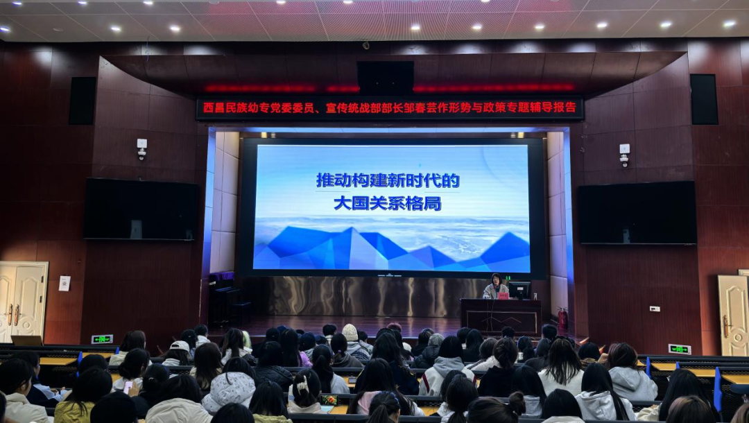 2024年12月30日,党委委员、宣传统战部部长邹春芸以《推动构建新时代的大国关系格局》为题在学术报告A厅为职业教育系24级智慧健康养老专业学生作形势与政策专题辅导报告。她从大变局下国际格局调整的主要表现、解决国际问题时大国发挥的作用、负责任大国的责任与担当等方面深刻阐释了构建新时代大国关系格局的深刻内涵。她强调,同学们要认识到大国对全球战略稳定负有关键责任,国际形势越动荡,大国越要加强协调,风险挑战越突出,大国越要增进合作;认识到百年大变局下的中国一直致力于促进大国协调和良性互动,推动构建和平共处、总体稳定、均衡发展的大国关系格局,为世界注入稳定性、确定性、建设性。同时强调同学们应该在百年大变局的世界新形势下,要重视个人综合素质和专业能力的提升。