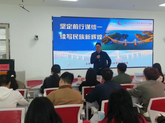 2024年10月22日,党委委员、纪委书记沙德康以《坚定前行谋统一 续写民族新辉煌》为题在伟大建党精神思政教育虚拟仿真实训室为职业教育系23级智慧健康养老专业专业作形势与政策专题辅导报告。他深刻分析了目前台海复杂严峻的形势及面临的挑战。强调同学们要深入学习领会习近平总书记就发展两岸关系、推进祖国统一进程发表的重要讲话精神,正确认识当前两岸关系和台海形势,全面准确理解党中央对台工作的方针政策,自觉积极参与两岸交流合作,为推进祖国完全统一贡献力量。
