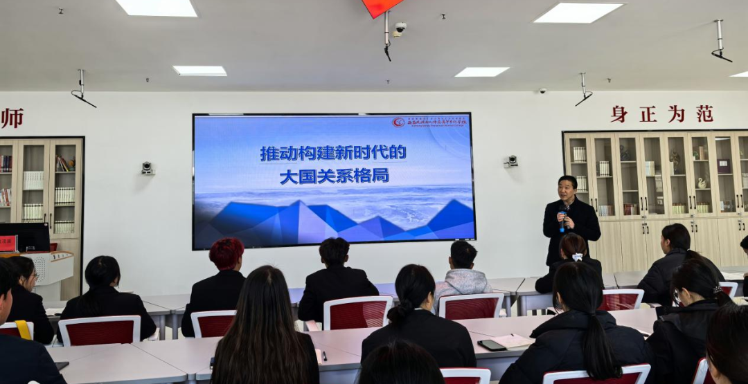 2024年12月4日,副校长袁顶国以《推动构建新时代的大国关系格局》为题在伟大建党精神思政教育虚拟仿真实训室为职业教育系24级旅游管理专业学生作形势与政策专题辅导报告。他从百年大变局下国际格局调整的主要表现、解决国际问题时大国发挥的作用、负责任大国的责任与担当、中国如何构建新时代的大国关系格局等方面深刻阐释了构建新时代大国关系格局的深刻内涵。他强调,同学们要认识到大国对全球战略稳定负有关键责任,国际形势越动荡,大国越要加强协调,风险挑战越突出,大国越要增进合作;认识到百年大变局下的中国一直致力于促进大国协调和良性互动,推动构建和平共处、总体稳定、均衡发展的大国关系格局,为世界注入稳定性、确定性、建设性。同时强调同学们应该注意人生的时间线和空间线,要注重从全球的视角认识人生的意义。