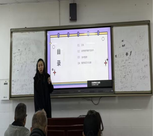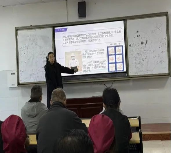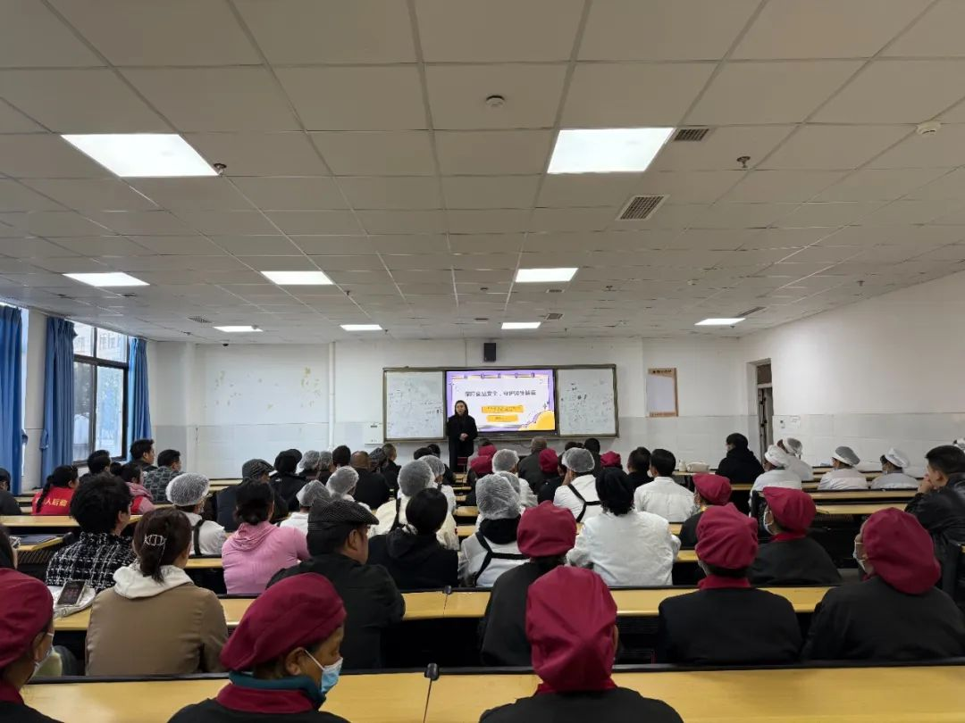 培训会上,后勤与国资管理处陈晓老师结合本校食堂的情况,针对迫切需要整改的问题,从四个方面给从业人员开展培训:一是卫生培训强调全方位清洁消毒,涵盖厨房、就餐区,明确流程与标准,要求严格落实,为师生打造洁净就餐环境;二是设备维护及操作,通过规范操作、定期检查、维护和及时维修,可显著降低设备故障率,保障食堂高效、安全运转;三是食材管理培训着重于采购源头把控、储存规范及食材加工要求,保障食材新鲜安全,严格执行食品留样制度;四是服务规范与沟通,从仪容仪表、礼貌用语、处理投诉技巧等方面提升员工服务意识与沟通能力。