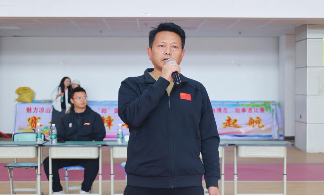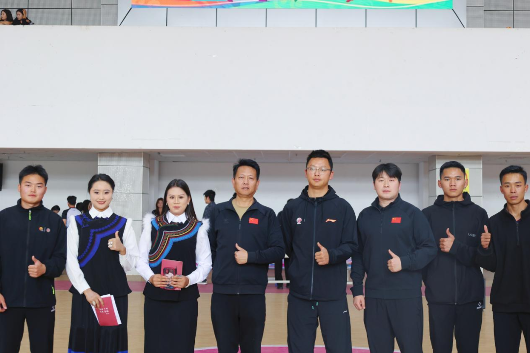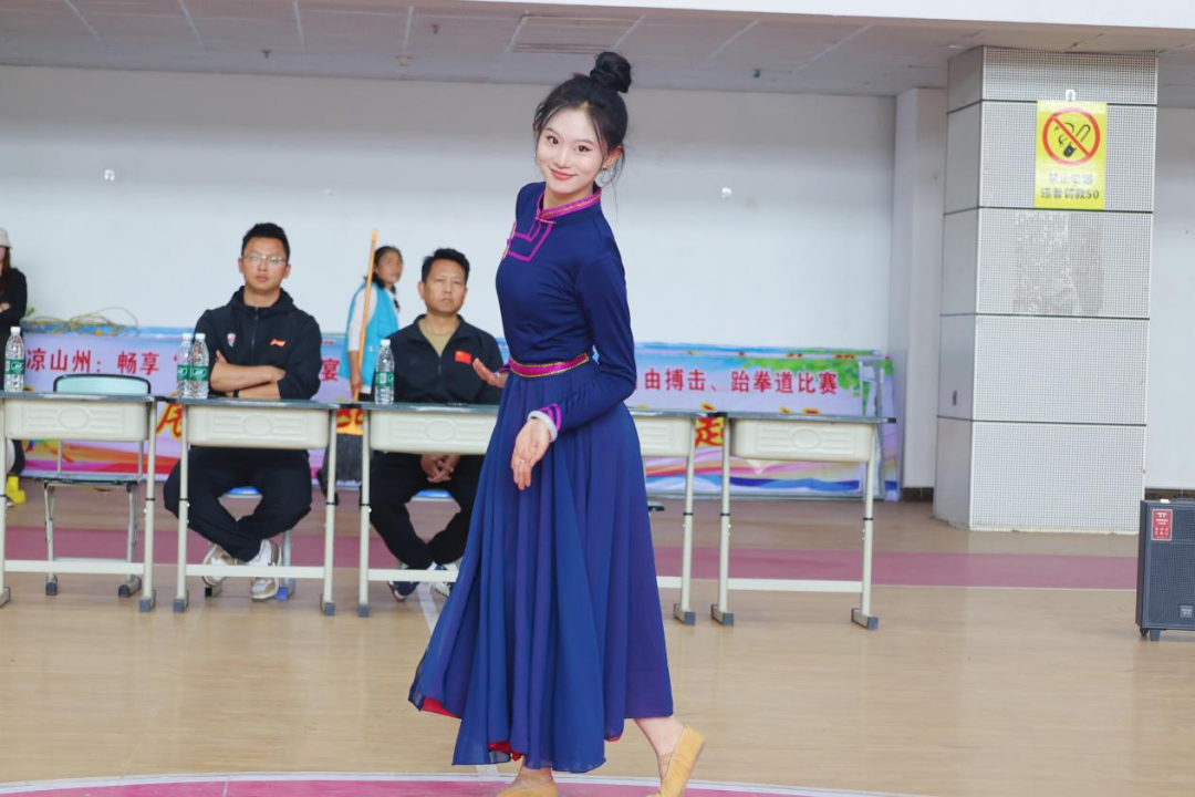 裁判员代表沙春林和喜德队代表阿西小平分别进行了宣誓,表示要做到公平竞争、公正裁判,营造良好的比赛氛围,争创优异成绩。23级职教系陈涵雪同学身着蓝袍跳蒙古舞助阵,轻盈的舞姿尽显民族文化魅力。