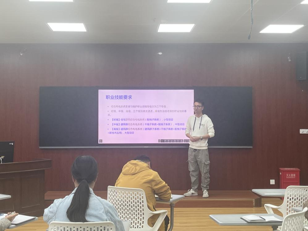 活动伊始,何沛欣老师进行了“网络综合布线技术”的分享。他结合实际案例,详细介绍了网络综合布线的基本原理、设计要点、施工流程以及常见问题的解决方法。通过生动的讲解和丰富的图片展示,老师们对网络综合布线技术有了更深入的理解,为后续教学中相关课程的开展提供了有力支持。