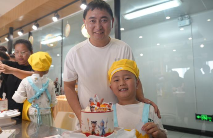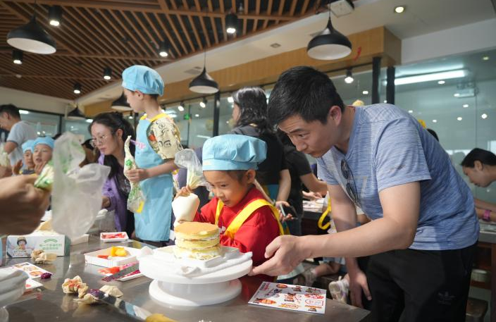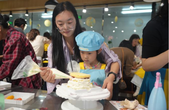 茶歇时分,清甜的果汁与精致的小点心为活动注入满满能量。紧接着,专业烘焙师现场示范教学,奶油花朵如何绽放,巧克力彩绘怎样生动,孩子们看得目不转睛。亲子协作环节中,蛋糕胚化作创意画布:有的家庭点缀上星星糖果,寓意“星光璀璨”;有的家庭用草莓拼出笑脸,象征“快乐成长”。活动现场香气四溢,笑声朗朗,家长俯身指导的温柔,孩子完成作品时的雀跃,构成了一幅幅动人的画面。