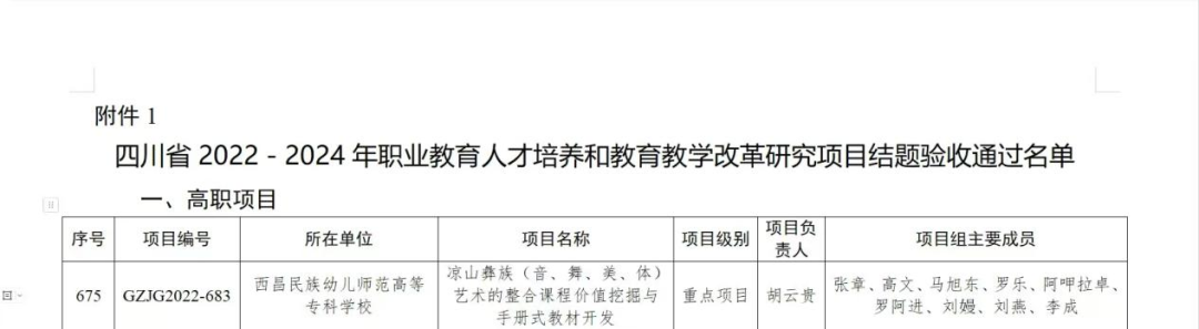 日前,四川省教育厅揭晓2022-2024年职业教育人才培养与教育教学改革研究项目验收结果。我校艺术教育系省级教改重点项目《凉山彝族(音、舞、美、体)艺术的整合课程价值挖掘与手册式教材开发》凭借扎实的研究成果和创新实践,顺利通过评审实现高质量结项。该成果不仅是我校深耕艺术类专业内涵建设、推动教育教学改革纵深发展的有力见证,更标志着我校在民族艺术教育资源开发、特色课程体系构建领域取得重大突破,为职业院校艺术教育改革与民族文化传承创新提供了可借鉴的实践样本。