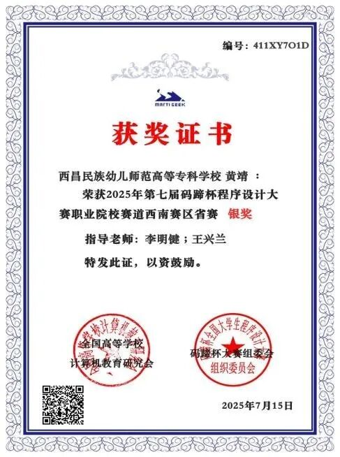 由全国高等学校计算机教育研究会主办的"码蹄杯"程序设计大赛,我校信息技术系(中心)黄靖同学在激烈的竞争中成功斩获省赛银奖。