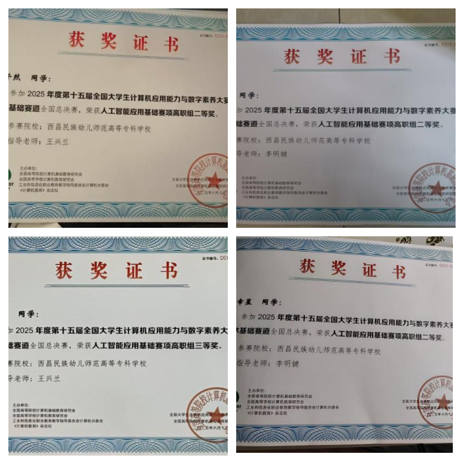 在全国大学生计算机应用能力与数字素养大赛中,我校信息技术系(中心)黄子然、蓝琪和肖幸星同学在人工智能赛道获得国赛二等奖、宋诗华和王辛瑜同学获得国赛三等奖,获奖数量和等级均实现新突破。