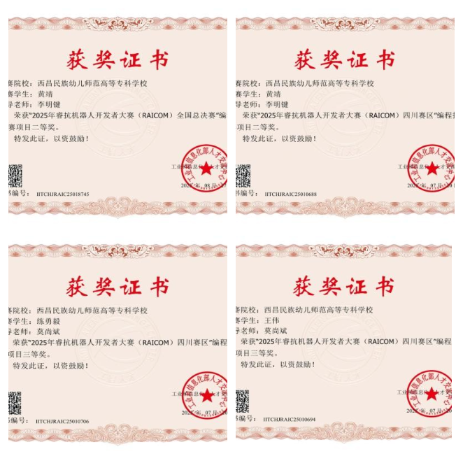 由工业和信息化部人才交流中心主办的睿抗机器人开发者大赛(RAICOM),在"编程技能竞赛"项目中我校信息技术系(中心)黄靖同学斩获国赛二等奖,练勇毅和王伟同学斩获省赛三等奖。
