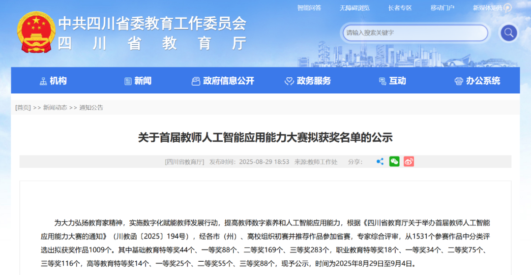 近日,四川省教育厅公布了首届教师人工智能应用能力大赛获奖名单。我校学前教育系选送的作品——《AI赋能·智联成长:民族地区师范院校教师数字素养提升实践与创新案例》在全省1531件参赛作品中脱颖而出,荣获职业教育组一等奖,充分展示了我校在教师数字素养发展与人工智能教育应用方面的扎实基础和创新能力。