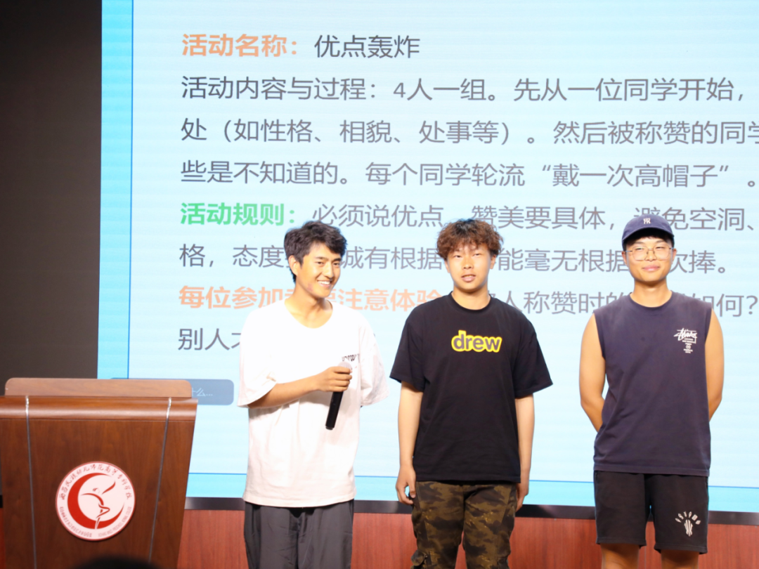 讲座邀请小学教育系副教授毛琼老师担任主讲,她围绕大学生活面临的四大变化,结合真实案例和互动练习,从情绪调节、积极自我认知、学习管理及人际交往四个方面提出具体建议,为同学们深入浅出地讲解了心理适应的实用技巧。现场开展了“优点轰炸”小组活动,让同学们在互动中体验认可与被认可的力量,学会了倾听、换位思考与真诚赞美。