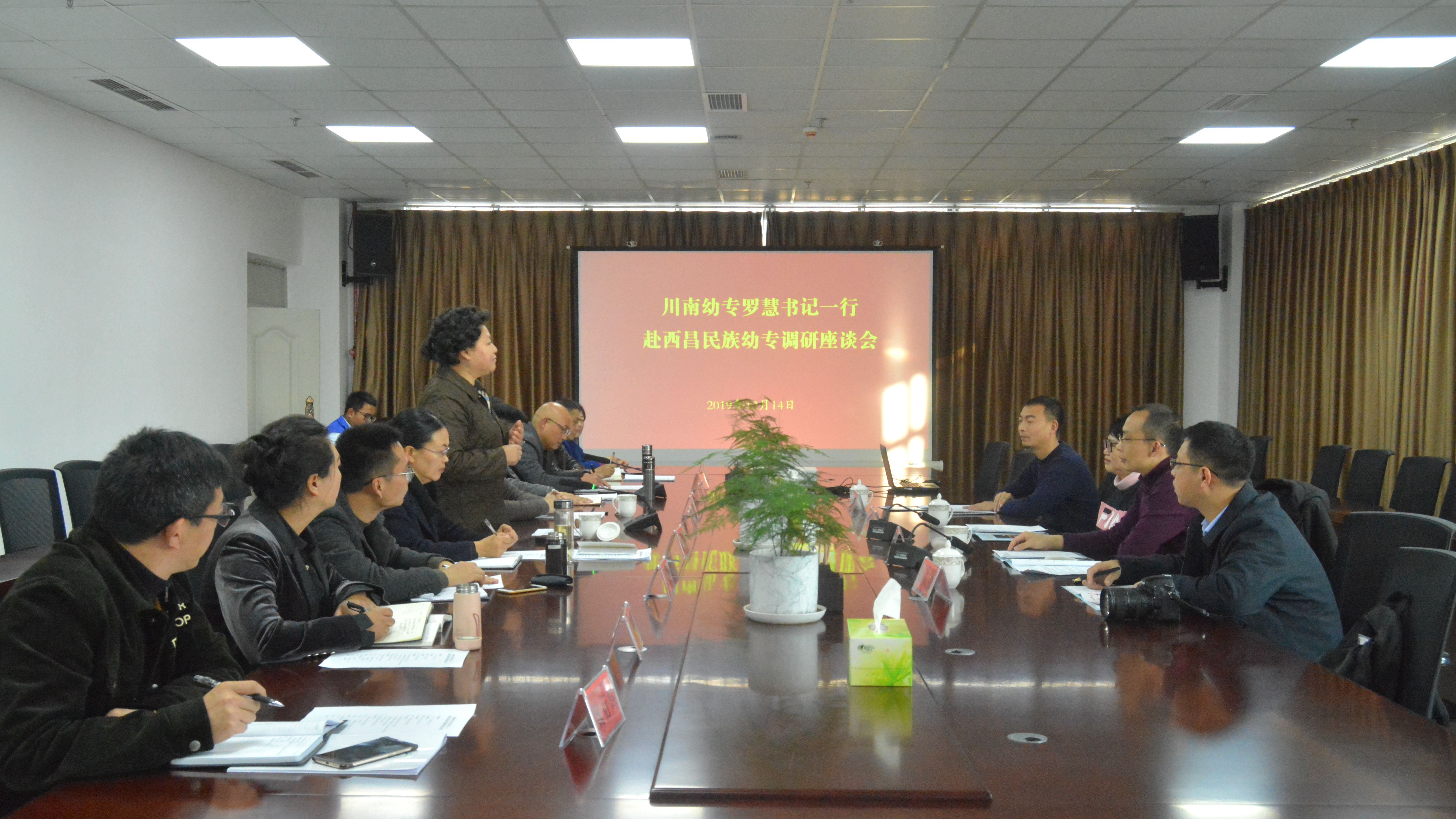 石芳对罗慧一行表示热烈欢迎,并对川南幼专在学校创建初期的鼎力支持表示衷心的感谢。石芳她指出,西昌民族幼专创建不易,担负发展凉山州教育重任,使命光荣,希望以两校对口支援为契机,深化合作,助力学校内涵发展,规范入流,实现弯道超车。