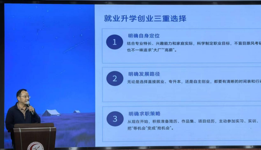 信息技术系(信息中心)副主任李怀阳结合企业调研情况分享经验。他以近期走访多家信息技术企业的实际经历为依托,从行业发展趋势、企业招聘需求、岗位技能标准等方面展开深度解读。他强调,当前企业对技术型人才的需求更侧重实操能力、团队协作能力与创新意识,其中人工智能、大数据、软件开发等领域的专业人才缺口显著。他鼓励同学们针对性弥补专业短板,熟练掌握核心技能,同时注重综合素质提升,以精准适配企业岗位要求。此外,他还分享部分企业的招聘偏好与薪资待遇信息,为同学们提供实用的就业参考依据。