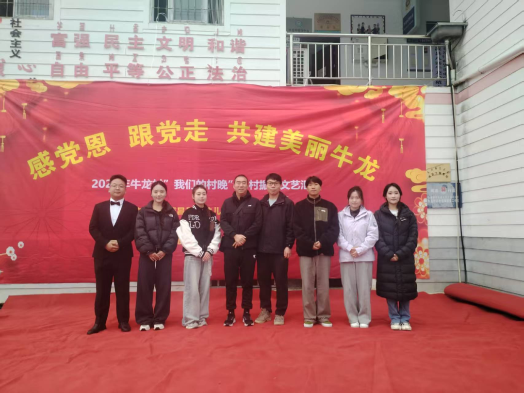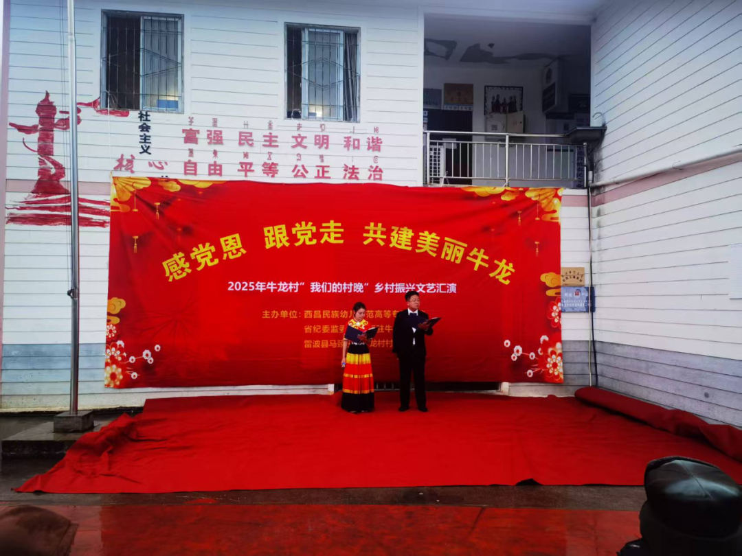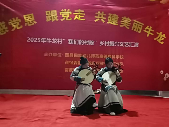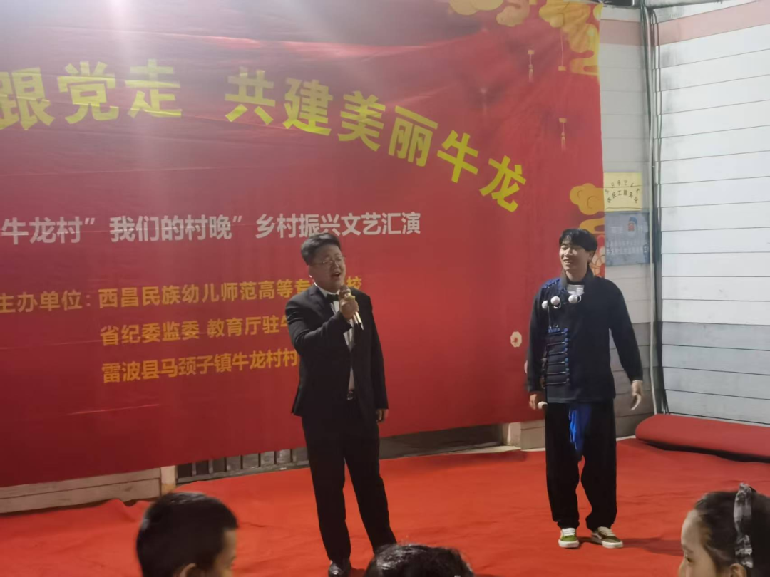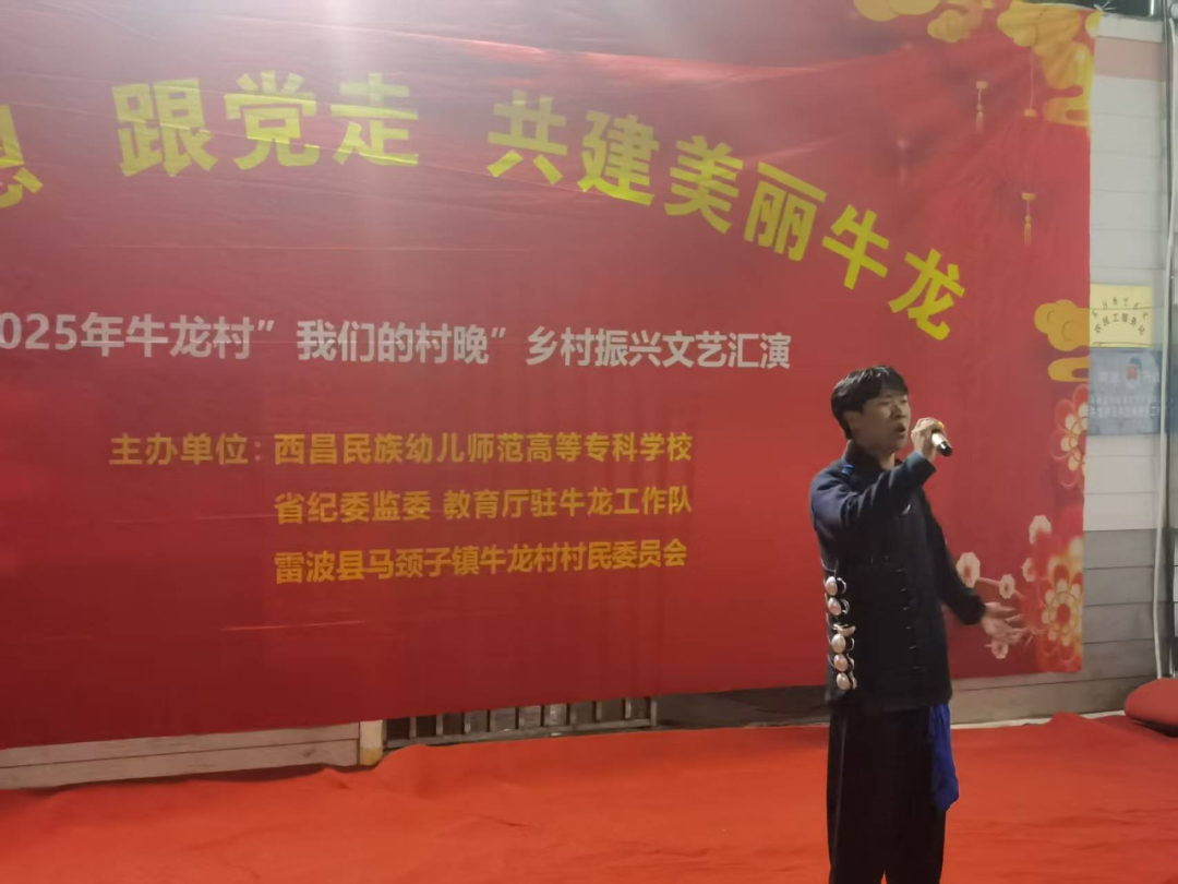 当晚,“我们的村晚”文艺汇演在婆娑小雨中温情上演,点亮了彝家村寨的夜晚。晚会以“感党恩 跟党走 共建美丽牛龙”为主题,节目异彩纷呈:我校师生带来的《彝族高腔》《我的情歌》情深意长,舞蹈《姑娘的红裙》《姑娘的耳环》绚丽夺目。最终,全体观众在学生月琴伴奏的《留客歌》中齐声合唱,将彝族同胞的热情好客展现得淋漓尽致。其间穿插的多轮抽奖环节,更为村民们送上了驻村工作队与我校准备的精美礼品,现场欢声笑语,气氛热烈。