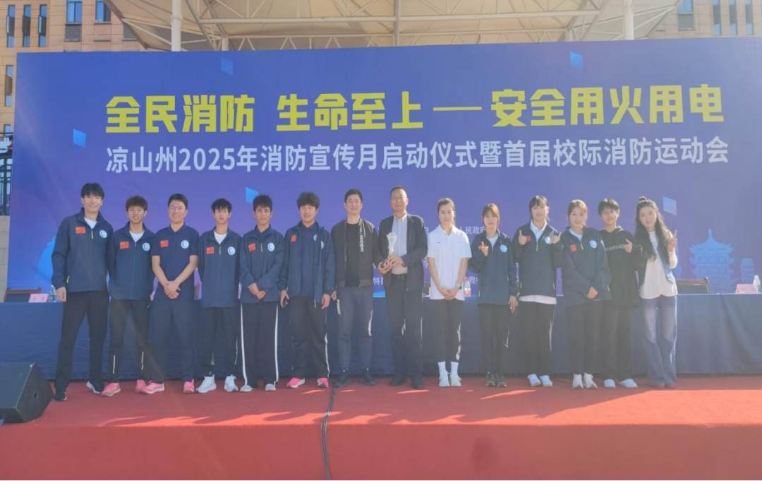 为响应凉山州消防安全委员会办公室关于开展2025年消防宣传月启动仪式暨首届大学生消防运动会的号召,切实强化师生消防安全意识与实操技能。近日,我校安全保卫处处长牟勇,基础教学部学工副主任李剑锋带领10名运动员赴凉山州消防救援支队培训基地参赛,最终团队凭借扎实专业的技能与默契协作,取得团体二等奖的优异成绩。