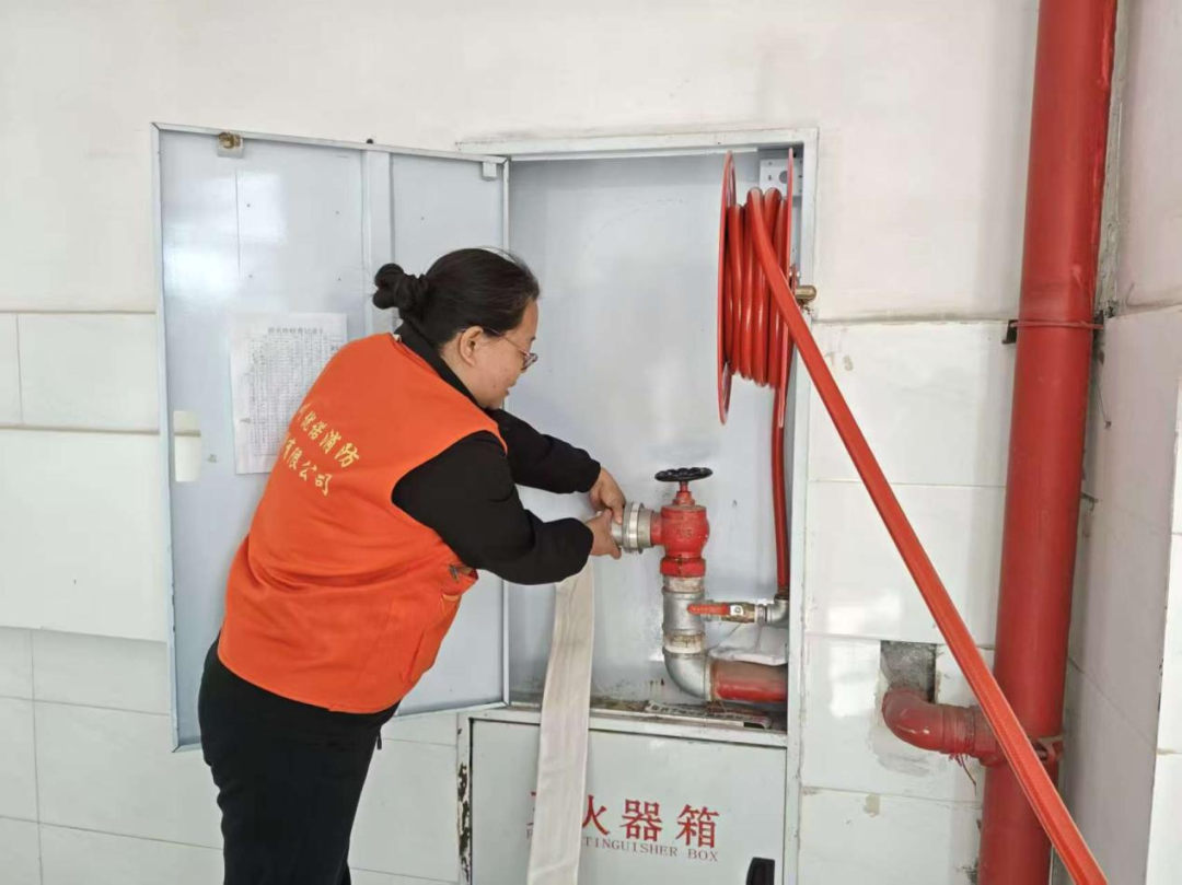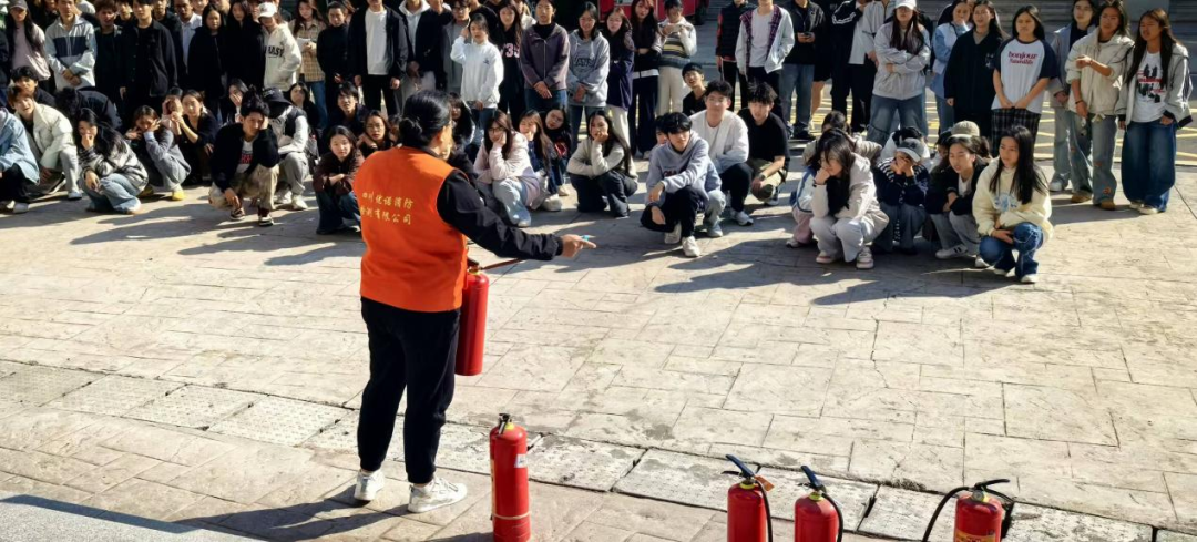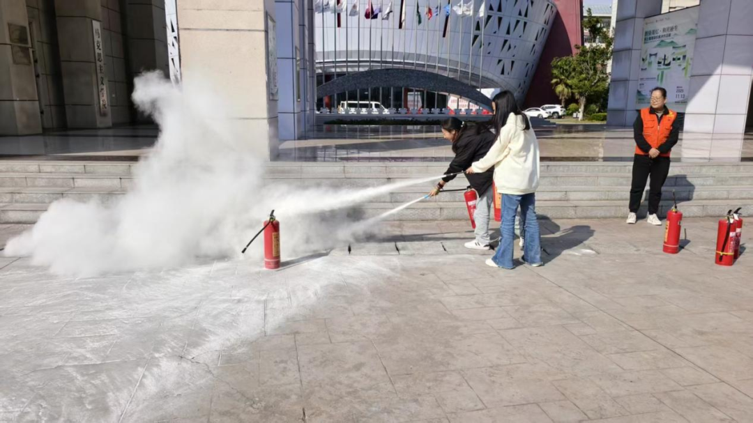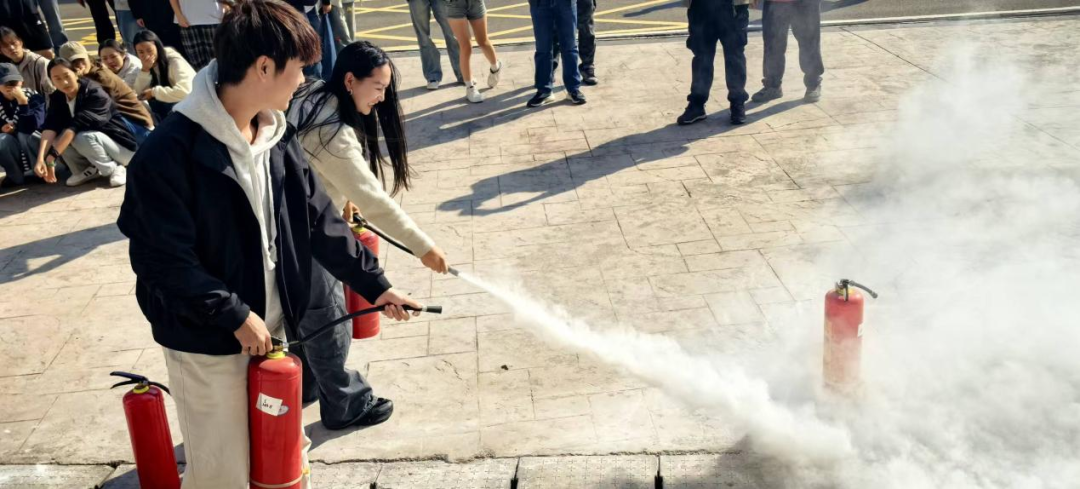 疏散环节结束后,学校消防维保专业人员为师生现场讲解并演示了常用消防器材的使用方法。在场师生认真聆听了灭火器的种类、适用火情及操作要领,部分师生在专业人员指导下进行了灭火器实操体验。大家轮流上阵,按照“提、拔、握、压”的步骤,亲手操作灭火器扑灭模拟火源,进一步掌握了初期火灾的扑救技能。通过互动体验,师生不仅增强了消防器材的实际应用能力,也对火灾应急处理流程有了更直观、更深刻地理解。