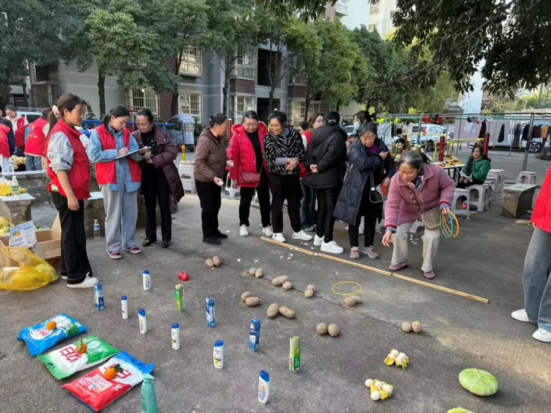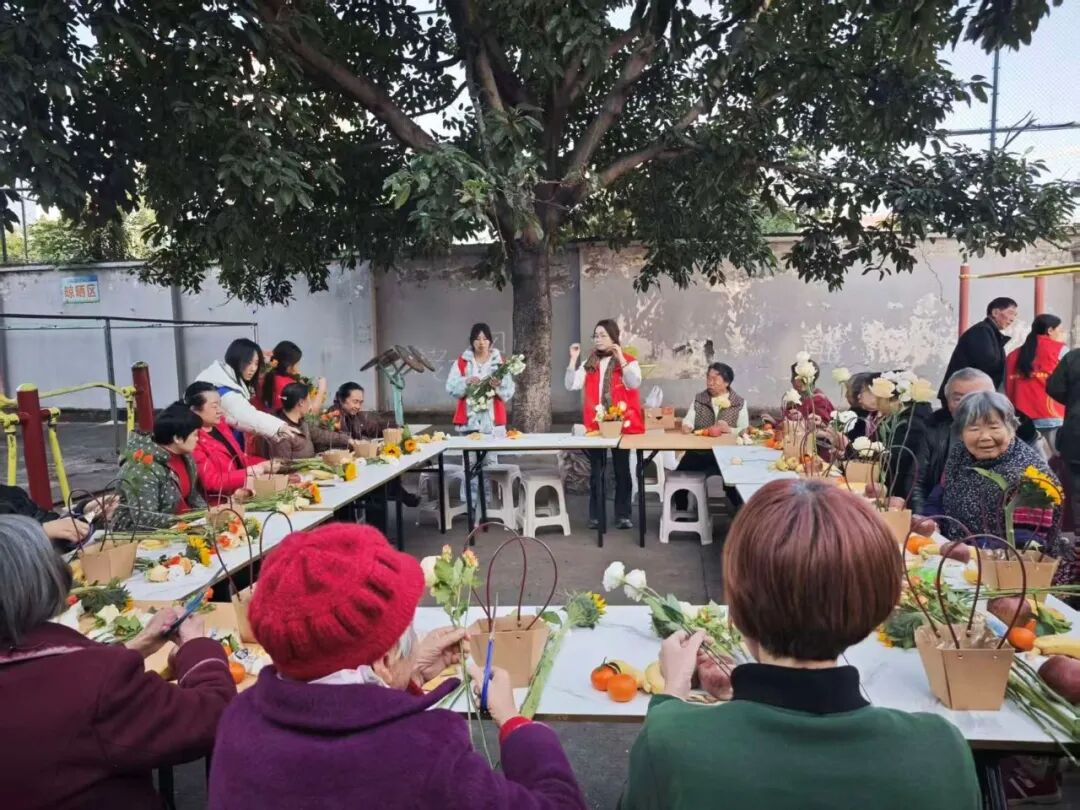 在幸福家园小区公共活动区开展的集中活动中,学生们充分发挥组织协调能力,引导老人参与套圈赢蔬菜、创意插花等趣味活动。活动现场欢声笑语不断,设计的互动环节既锻炼了老人的手脑协调能力,又促进了邻里情感交流。学生们还适时开展老年健康知识宣传,将专业理念融入轻松氛围。