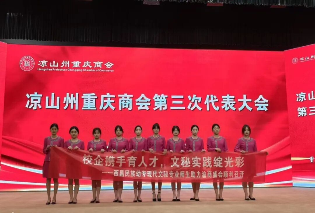 近日,凉山州重庆商会第三届理事会暨换届大会在西昌顺利召开。应商会邀请,我校小学教育系现代文秘专业精心选派10名学生组成礼仪服务团队,全程负责大会各项礼仪服务保障工作。学生们凭借专业的仪态、细致的服务和饱满的精神面貌,出色完成了嘉宾引领、会场接待、流程协调等多项任务,获得主办方、与会嘉宾及社会各界的一致好评。