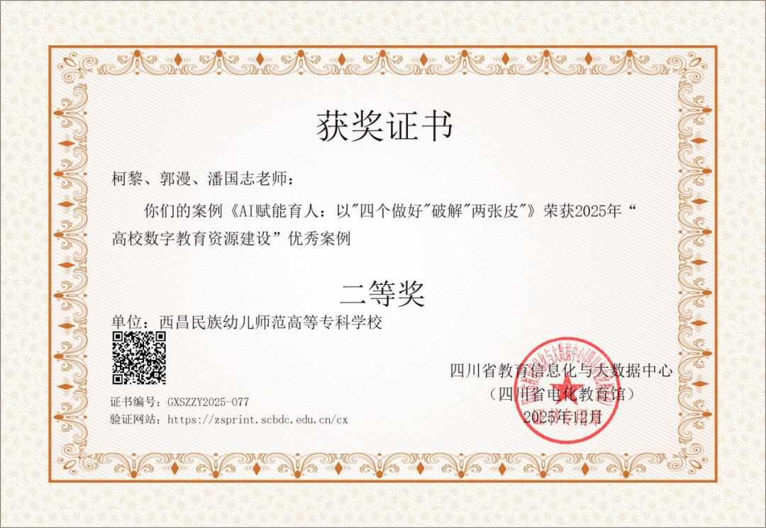近日,在四川城市职业学院眉山校区召开的四川省高等教育学会教育信息化专业委员会2025年学术年会上,正式公布了2025年高校数字教育资源建设优秀案例评选结果。我校马克思主义学院报送的2项案例全部入选,其中《AI赋能育人:以“四个做好”破解“两张皮”》荣获二等奖,《红色凉山“数字活化”赋能“大思政课”实践育人》荣获三等奖。此次获奖是我校在教育数字化转型与思想政治教育深度融合进程中取得的一项重要成果,充分展现了马克思主义学院在数字教育资源建设方面的扎实基础与创新活力。