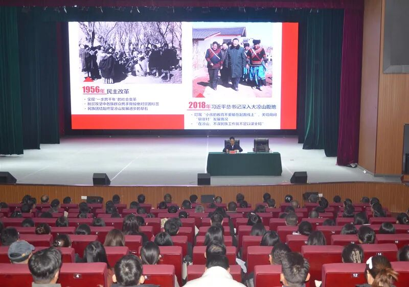 张文旺指出,铸牢中华民族共同体意识是新时代党的民族工作的“纲”,是推动凉山高质量发展的根本保障,更是广大青年的时代使命。他从历史逻辑、形势任务、理论内涵和实践路径四个维度,系统阐释了中华民族共同体意识在凉山这片多民族共生共荣土地上的深厚根基与时代价值。他说,从“一步跨千年”的民主改革,到打赢脱贫攻坚战、全面推进乡村振兴,凉山各族群众始终休戚与共、荣辱与共、生死与共、命运与共,这正是中华民族共同体意识的生动写照。希望广大师生今后无论走到哪个岗位,都能成为中华民族共同体意识的坚定践行者和积极传播者。
