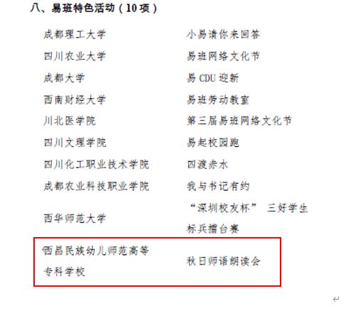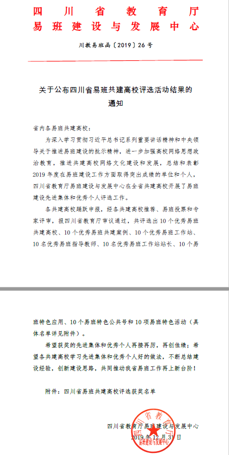 为进一步加强高校网络思想政治教育,推进易班共建高校网络文化建设和发展,在四川省教育厅指导下,四川省教育厅易班建设与发展中心开展了2019年四川省易班共建高校评选活动。经高校推荐、易班投票和专家评审,报四川省教育厅审议通过,学校报送的“秋日师语朗读会”荣获 “四川省易班十佳特色活动”。