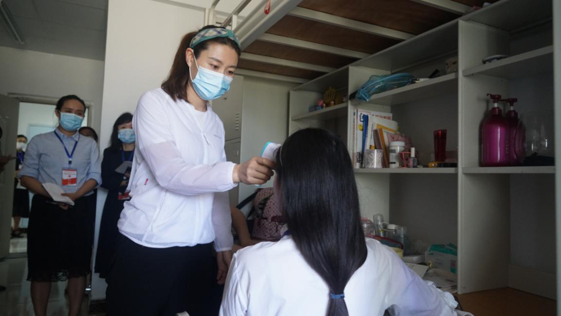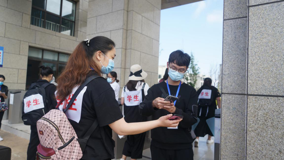 第六步 进入校园,行进路途中不扎堆、不聚集,至宿舍楼前按地面标识有序排队,再次扫二维码核实身份,测量体温后进入寝室。