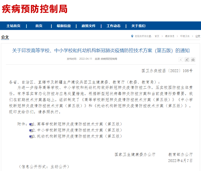近期全国多所学校出现聚集性疫情,暴露出了一些学校在疫情防控中仍然存在薄弱环节。为进一步科学指导各级学校和托幼机构做好新冠肺炎疫情防控工作,压实校园主体责任,有序落实常态化防控与应急处置措施,根据新型冠状病毒肺炎防控方案和当前疫情形势需要,对此前相关技术方案进行修订调整,形成了《高等学校新冠肺炎疫情防控技术方案(第五版)》《中小学校新冠肺炎疫情防控技术方案(第五版)》和《托幼机构新冠肺炎疫情防控技术方案(第五版)》。