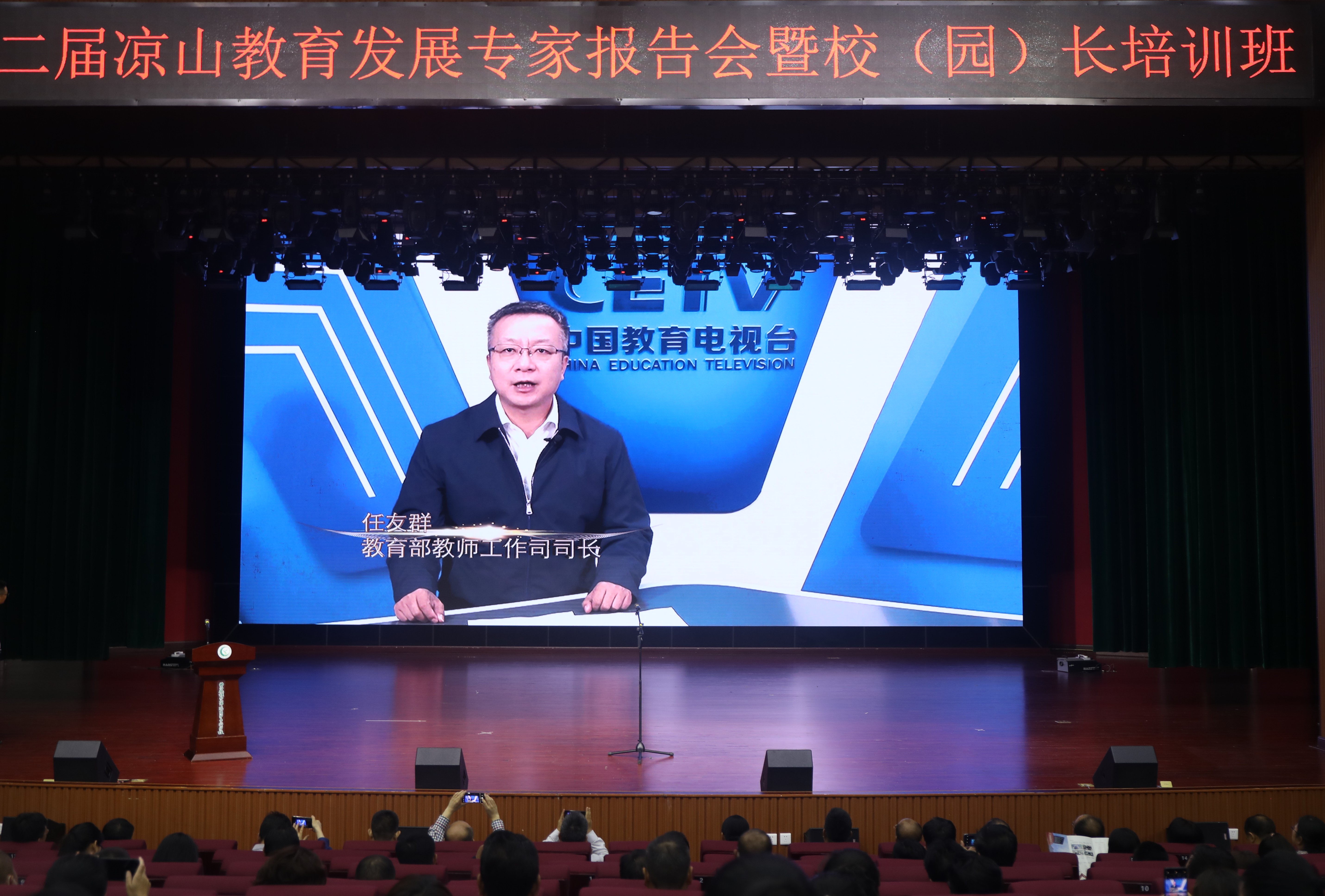 会上,教育部教师工作司司长任友群以视频的形式发表致辞,强调教育部组织力量对口支援西昌民族幼专,凉山州幼儿园、中小学等学校,变“输血”为“造血”,为凉山州打造一支“带不走、教得好”的高素质教师队伍,切实推进凉山教育事业发展再上新台阶;希望广大校(园)长充分利用好西南大学等高校和对口支援中小学的优质资源,树立规范严格、终身学习、追求进步的人生理念,团结带领广大教师将教书育人贯穿到教学全过程,用教育扶贫托起彝区新希望,以教育扶贫助力凉山打赢脱贫攻坚战。
