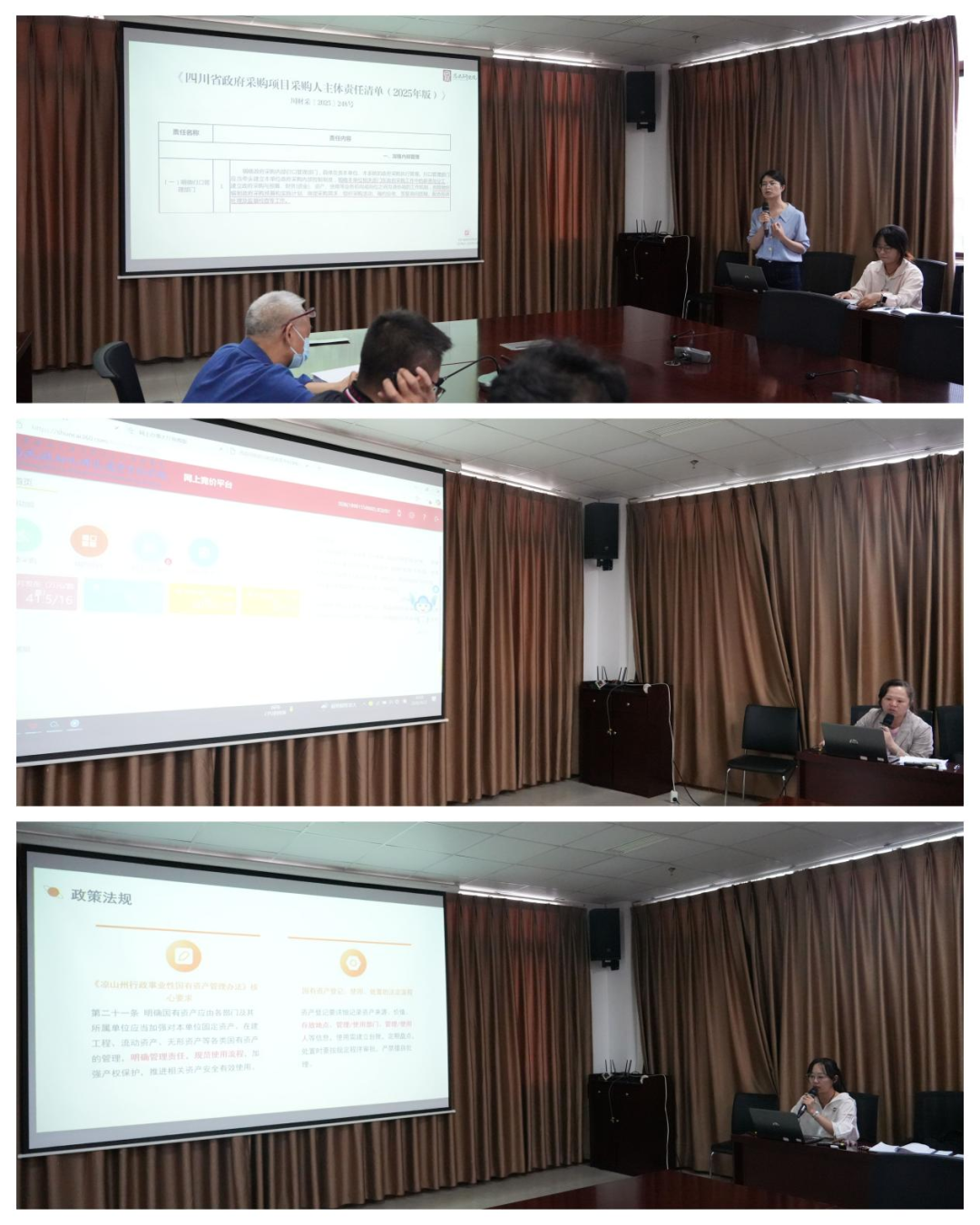 业务培训阶段,学校采购代理公司、后勤与国资管理处工作人员周燕围绕采购流程规范、意向公开、合同签订、质保金管理等内容开展专题培训;工作人员袁媛就国有资产登记、入账标准、清查盘点、动态管控及库存物品管理等业务进行详细讲解,明确采购与资产管理全流程操作要求。