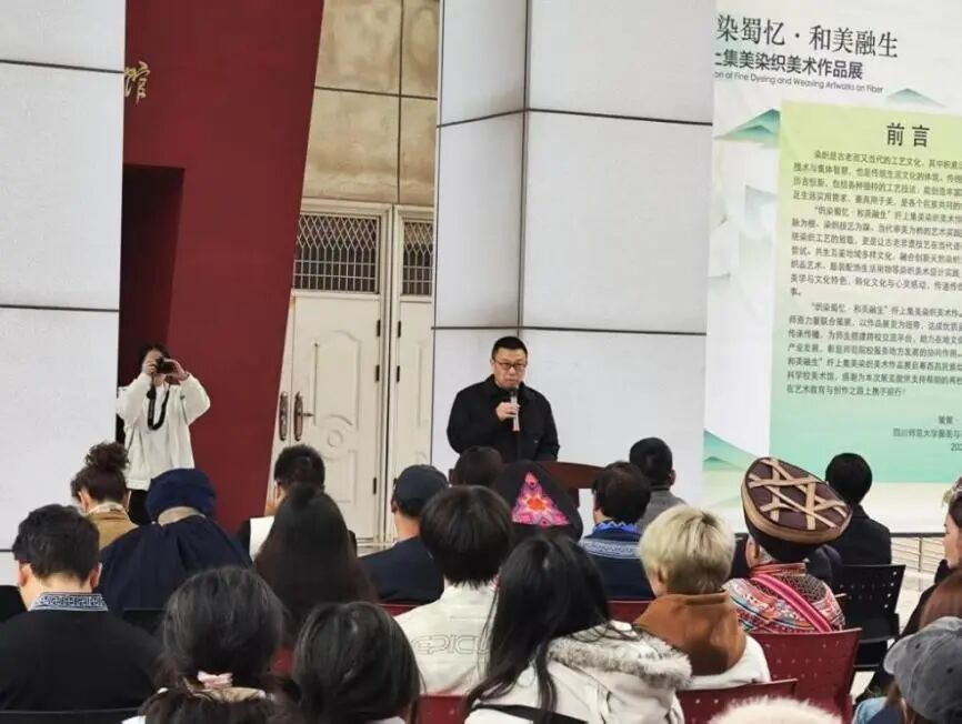 作品展主创四川师范大学服装与设计艺术学院副院长钟玮教授分享了展览策划理念,她强调以“传统工艺+现代设计”激活民族文化基因。展览以巴蜀造物为出发点,围绕传统染织工艺的当代表达、传承创新与自然生态美学展开,不仅将蜀缬、蜀锦织绣等在地染织工艺融入现代元素,还借助数字化技术增强传统工艺的传播力。