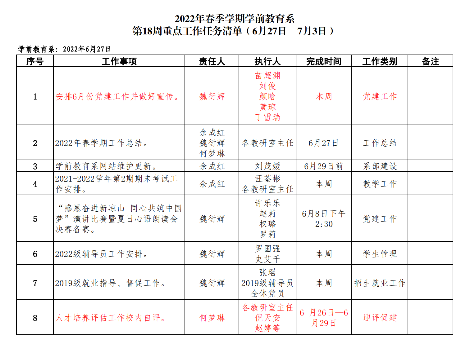 学前教育系第18周重点工作任务清单