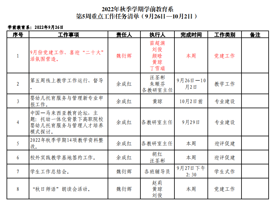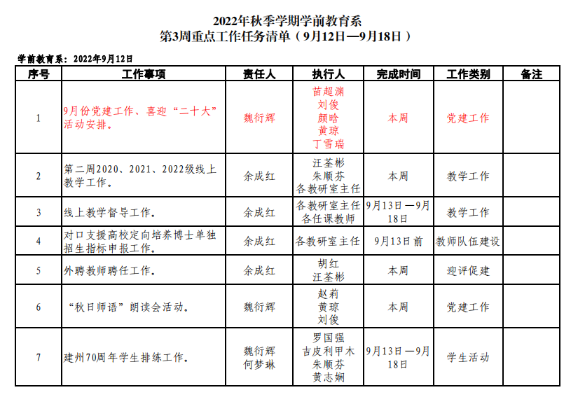 学前教育系2022年秋季学期第三周重点工作任务