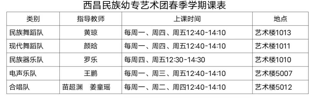 恭喜大家加入艺术团的大家庭 愿以后的日子 我们一起成长惊艳所有人 术造未来 入选的同学记得按时上课 以下是艺术团春季学期课表 注意查收