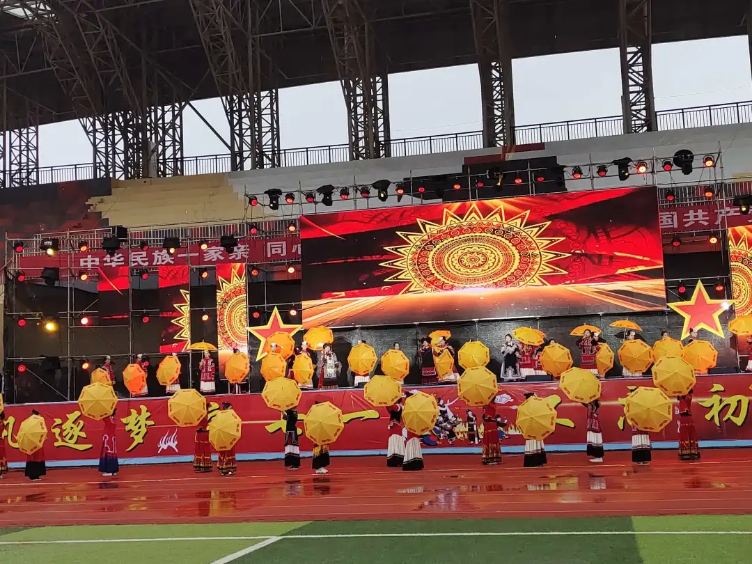 《祈福》正式拉开演出的序幕,声声号角吹颂着我校全体师生对党的祝福,美丽的《朵洛荷》舞蹈象征着党让我们的好日子红红火火,阳光灿烂照耀神州。
